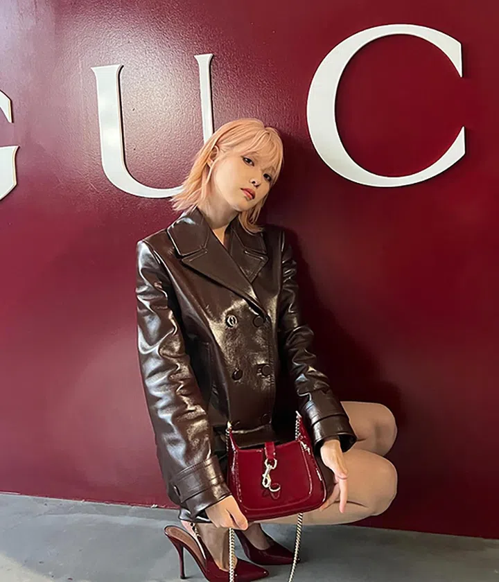Gucci全球品牌代言人IU以粉发+皮衣造型亮相Gucci创意总监Sabato De Sarno上任后首场秋冬男装秀,相比以前她梦幻、清秀的看秀造型,这次的穿搭更显犀利、帅气。