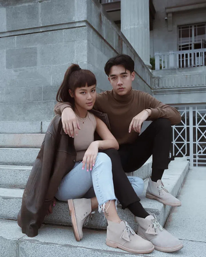 除了同款服装,也可以用同款鞋履+同色系服装搭配出一体感。比如同款球鞋及短靴等中性鞋款,让两人在服装不同时,也展现出相近的风格态度。