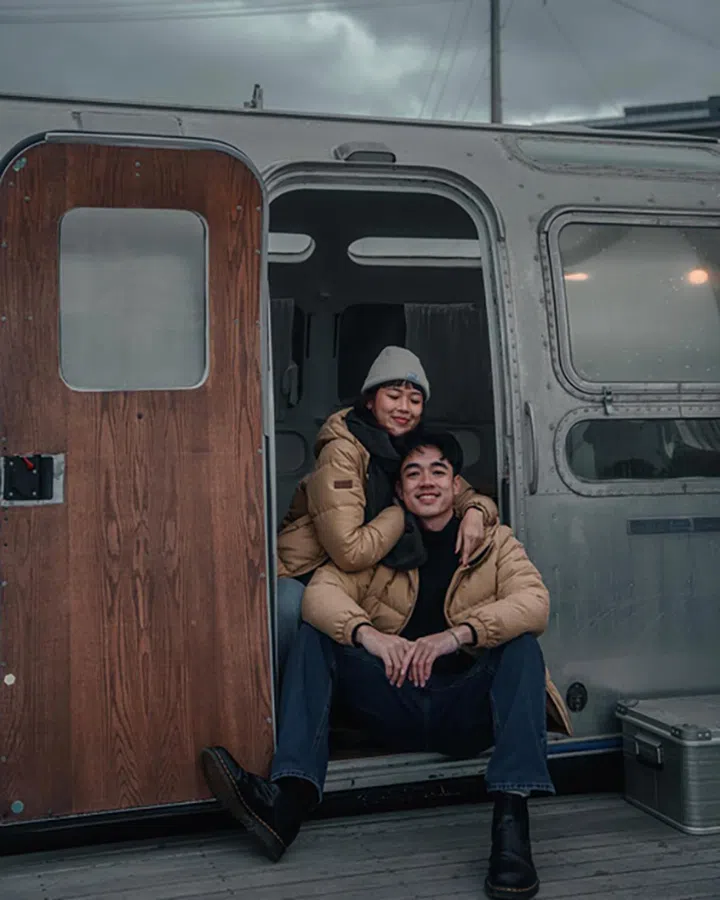 两人出国旅行,穿着同款保暖外套——如今不少品牌都推出男女适穿的中性设计,下次看见喜欢的好品质服装(或碰到在促销的时尚服饰),不妨选择中性色款式,多买一件和他一起穿。