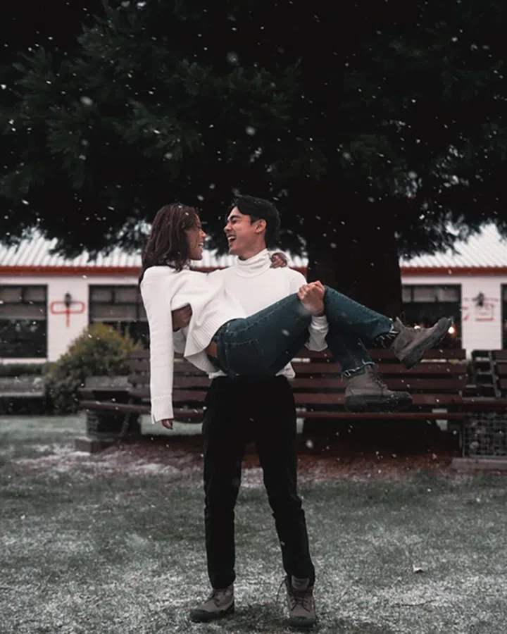 男友力十足的“公主抱”情侣照,谁看了不羡慕?两人都穿白色毛衣,视觉上仿佛融为一体,外加背景中还有雪花飞舞,场景和搭配可谓完美至极!