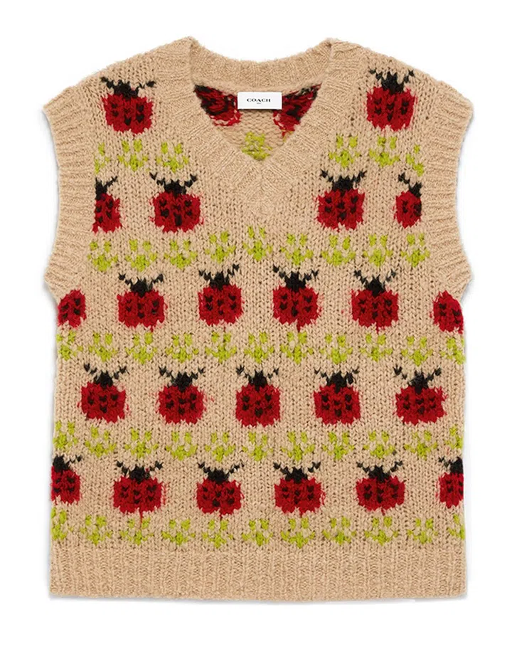 这款人气超高的瓢虫图案针织背心也很适合用来叠搭。而说起“叠搭”,你可知品牌首任设计师Bonnie Cashin在历史上其实老早就提出叠穿建议。她不喜欢厚重衣服,所以主张用多层轻薄服装进行叠穿。
