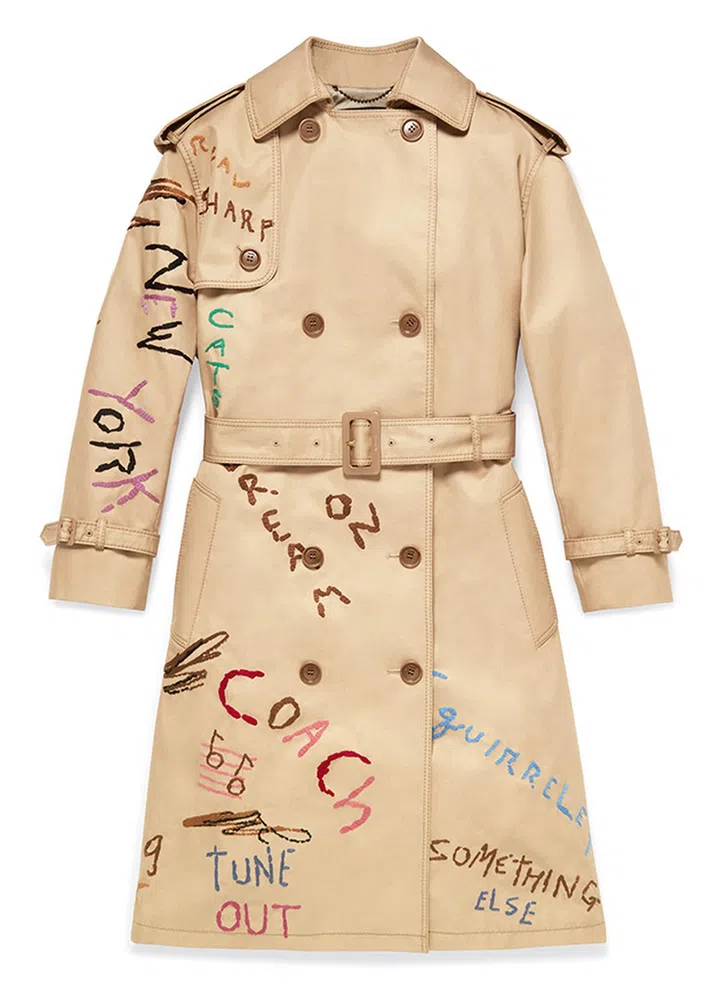 小编最爱系列中轻盈的手工刺绣风衣。上面装饰的美国俚语不仅给人带来快乐,其中一款的设计灵感是从品牌首任设计师Bonnie Cashin而来 。图中这一件风格经典又有趣味,让人下次出国旅行就想带上它。