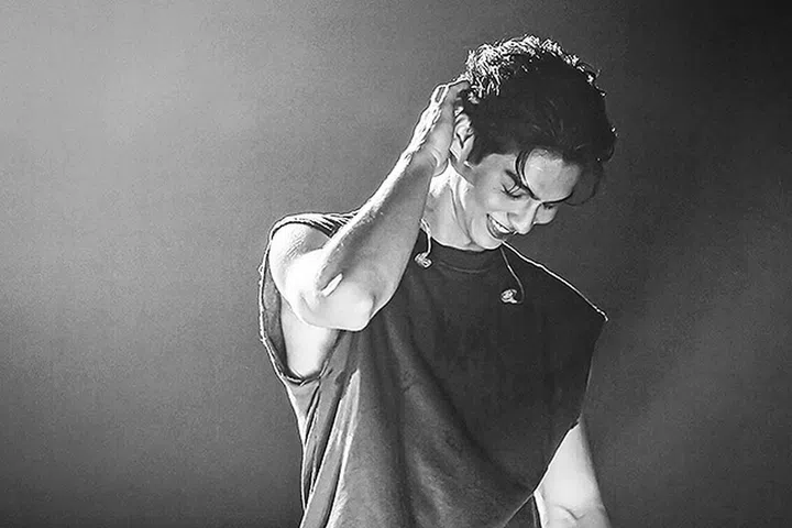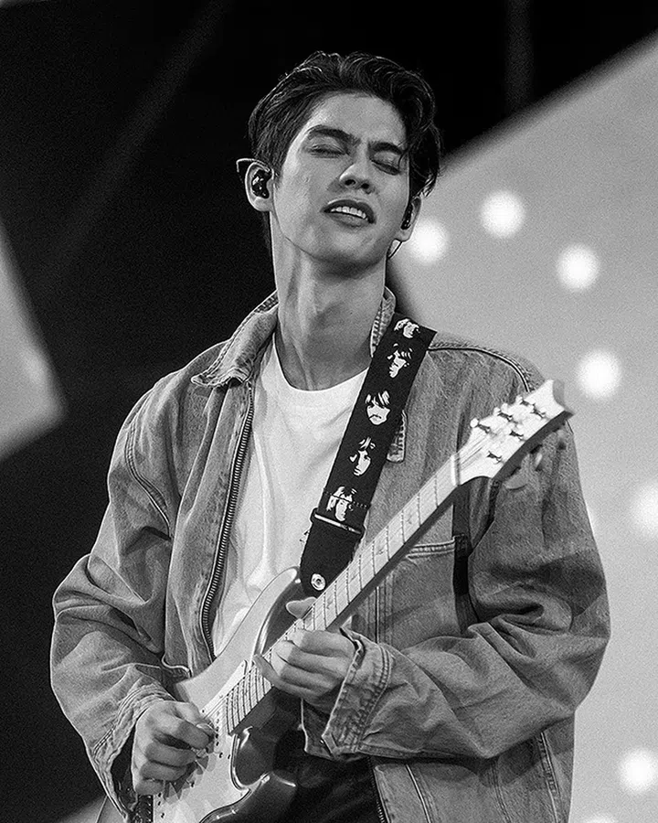 站在舞台上自弹自唱的Bright Vachirawit,有时穿着简单白T-shirt,有时穿着皮夹克或牛仔服。造型少了一丝刻意,完全自带明星范,展现出十足个人魅力。
