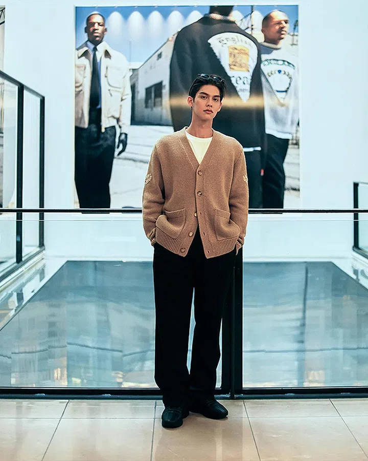 私下的Bright偏爱舒适的服装,常常穿着运动装、套衫、短袖衬衫及佩戴棒球帽。穿着这款驼色调的针织衫,让外型透露一丝叛逆的“道明寺”,也彰显出“花泽类”般的温柔感。