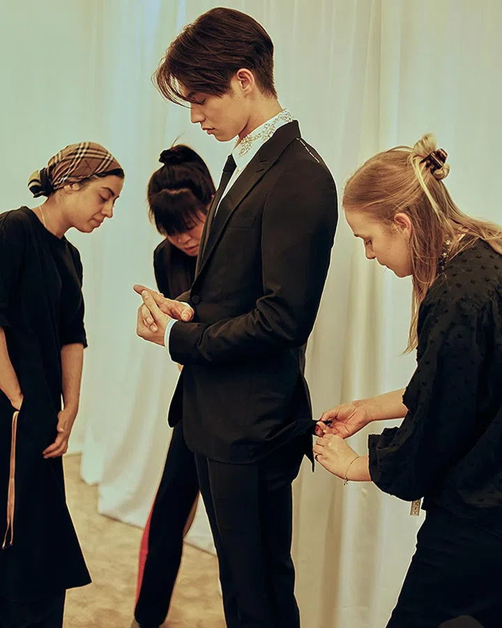 Burberry今年7月宣布泰国男星Bright Vachirawit成为南亚太地区的首位品牌大使,Bright月前也现身伦敦出席品牌2023春夏时装秀。其中IG这张(时装周造型)试衣照他穿上黑西装并搭配缀饰衣领衬衫,造型贵气十足,令人想起他的“泰国版道明寺”一角。