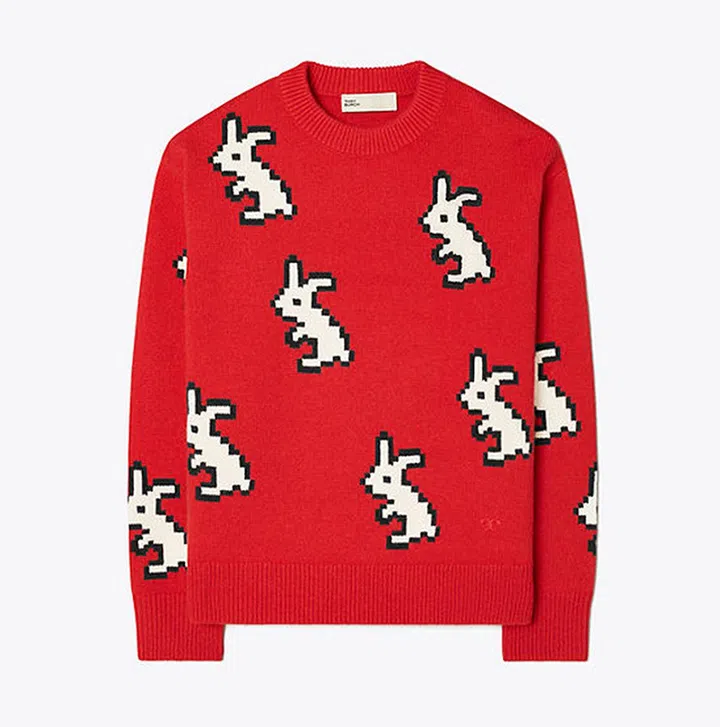 Tory Burch新年系列的喀什米尔毛衣,采用红色为底,装饰醒目的白色像素兔图案。可搭配品牌的兔子造型球鞋,让造型可爱值翻倍。