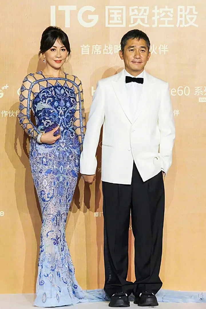 除了陪同梁朝伟走红毯,刘嘉玲也与费翔搭档颁奖。穿着精致礼服品牌Georges Hobeika 2023年秋季梦幻蓝色礼服的刘嘉玲,状态保持得绝佳!
