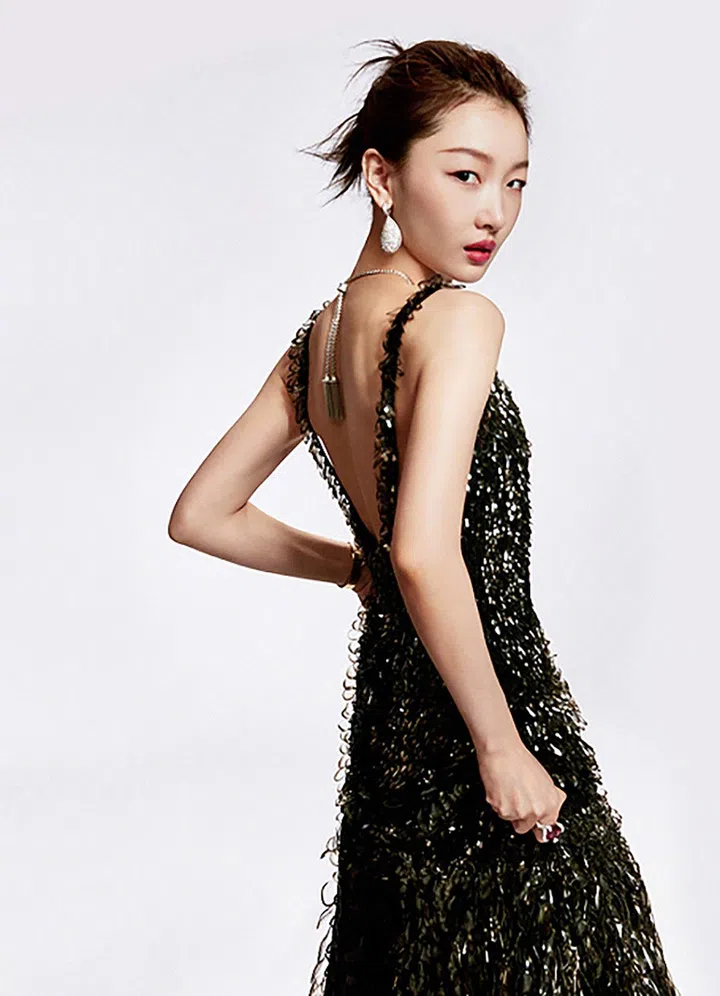 金光闪闪的礼服,可是将钟楚曦的皮肤衬托得更加白皙!出自Louis Vuitton的Rarex定制礼服,恰到好处的显现她姣好的身材~