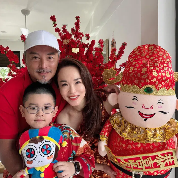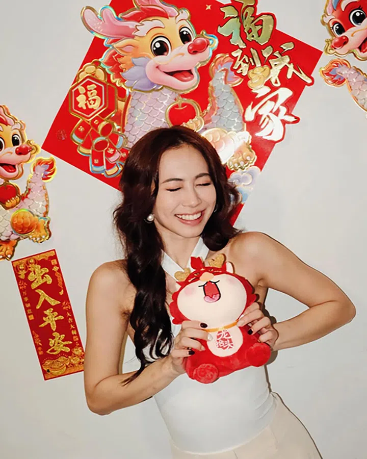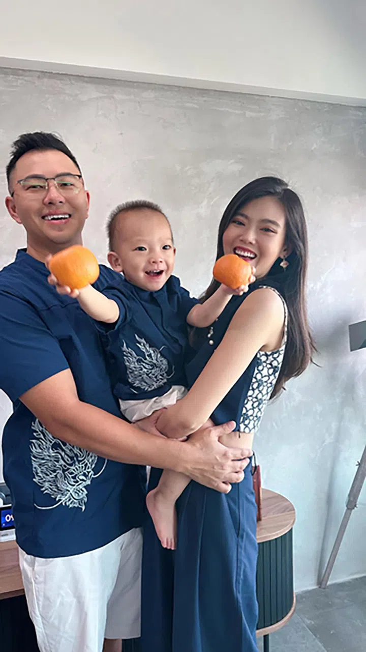谢静仪和家人为了新年都穿上了特别的蓝色龙年造型,她本人的搭配是一套上衣加裤装的两件式装束,巧妙融合了传统新年的庆祝元素与现代时尚的设计。