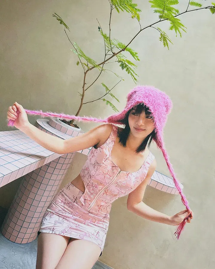 今年最可爱新春造型“颁”给黄暄婷,她选穿粉色提花胸衣+迷你裙两件套套装(可从ASOS购买),搭配软萌的粉色帽饰,造型讨喜,相信出门回头率也超高哦。