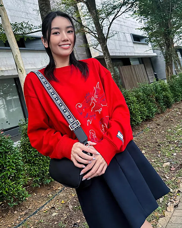 洪丽婷初一穿着Tommy Hilfiger和陈冠希潮牌CLOT联手打造的Tommy x CLOT系列龙年红色套衫,搭配短裙造型学院感十足。