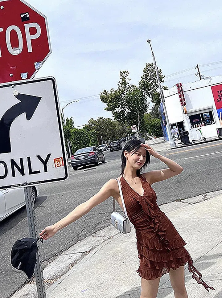 甚至,橘红色元素也可以是发色或口红。至于最当红的棕色系色调,不妨考虑Pantone 2023下半年流行色中的Hot Fudge(类似之前赵美延的连衣裙色)和Doe色(类似上图谢宛谕的连衣裙色)。