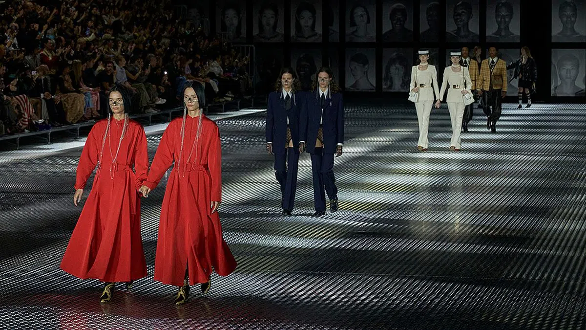 在时装秀现场,观众被分在两个空间里看秀(从直播可见观众坐在不同两侧),直到最后中间分隔屏拉起,模特们如镜像版映射,大家才惊喜发现他们竟同步看双胞胎走秀!