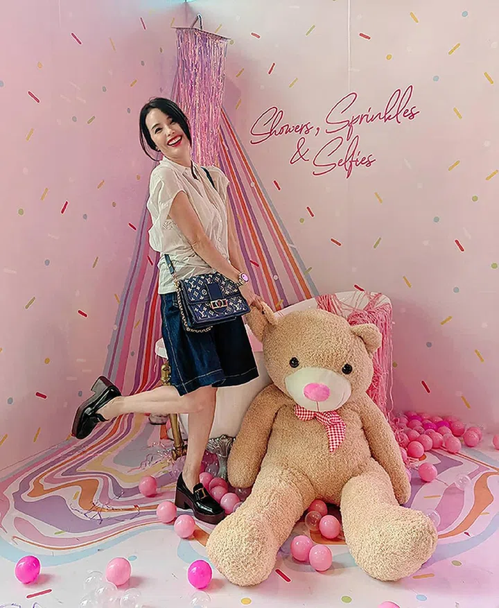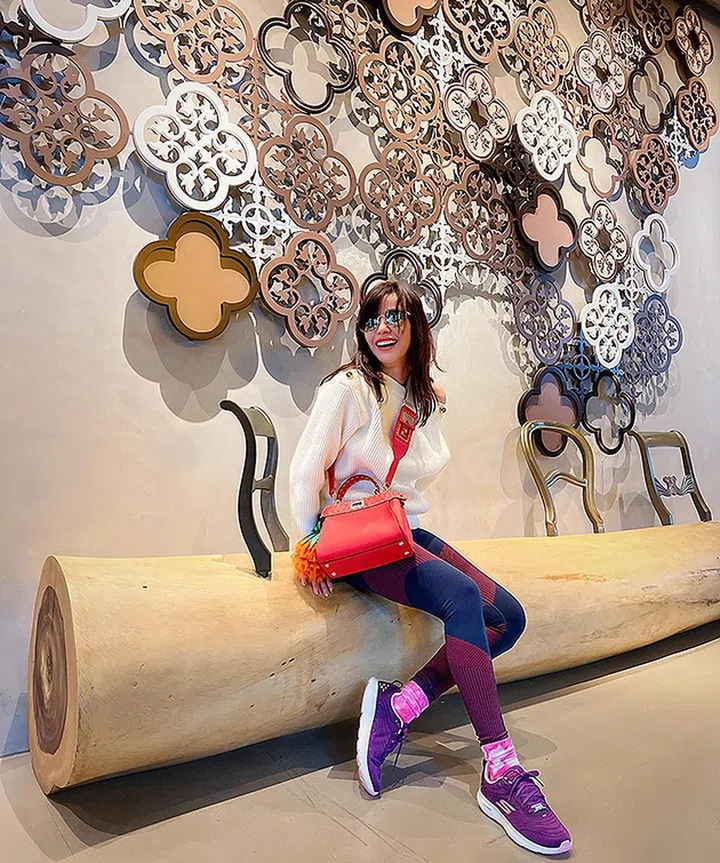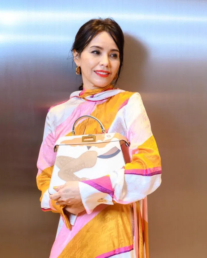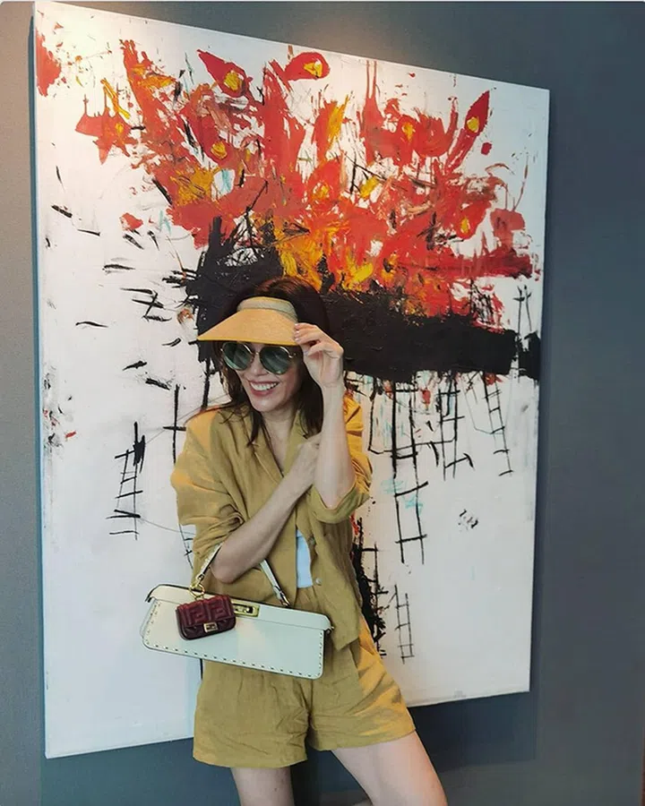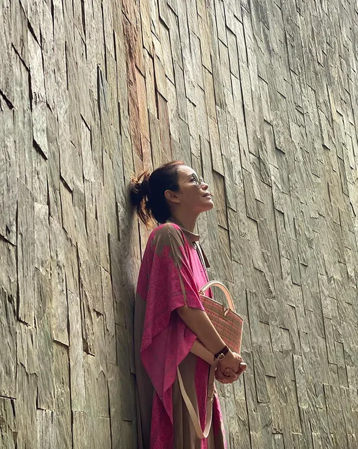 阿姐多次携带这组Fendi手袋搭配不同造型(比如还有这张仙气十足的连衣裙美照)。这个look以多彩和服装和背景,配上她超温暖的笑容,鼓励大家抓住当下,珍惜每一刻。