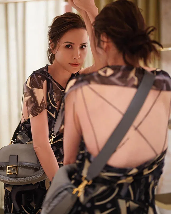 阿姐Zoe Tay穿上Fendi超飘逸的米白色长裙,搭配秀场造型的Peekaboo ISeeU Stretch长型手袋。但换掉长靴改穿品牌高人气的Fendi First穆勒高跟凉鞋,并为手袋点缀一款醒目的迷你袋bag charm。