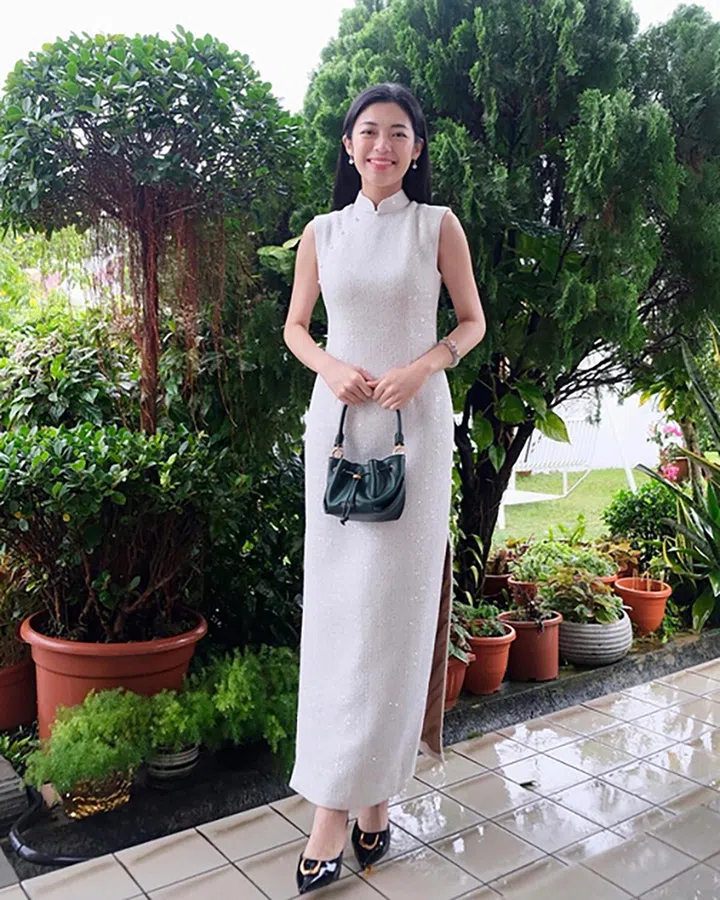 除了色彩鲜亮的喜庆旗袍,也有不少女星选择了淡雅清新的白色旗袍。其中,李巧儿穿着长款白旗袍搭高跟鞋,造型格外端庄大方(她的高跟鞋和手袋均来自Charles&Keith)。